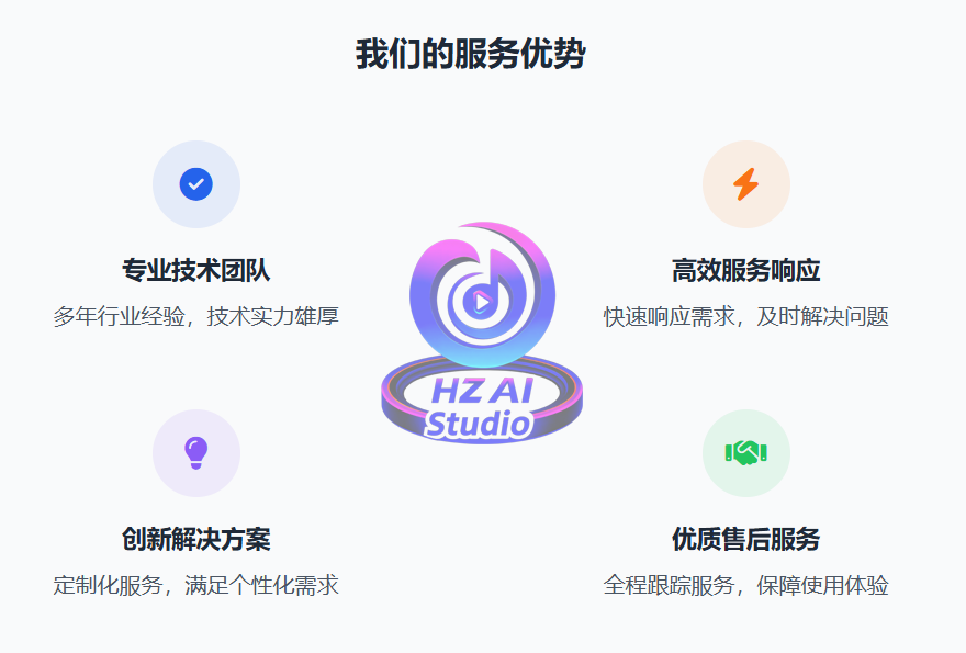 HZ-AI-STUDIO (海柱AI影音工作室) 致力于为创作者提供专业的音视频调试、直播间搭建、AI项目应用、效率软件分享和硬件设备推荐服务,助力您轻松迈入数字化创作新时代